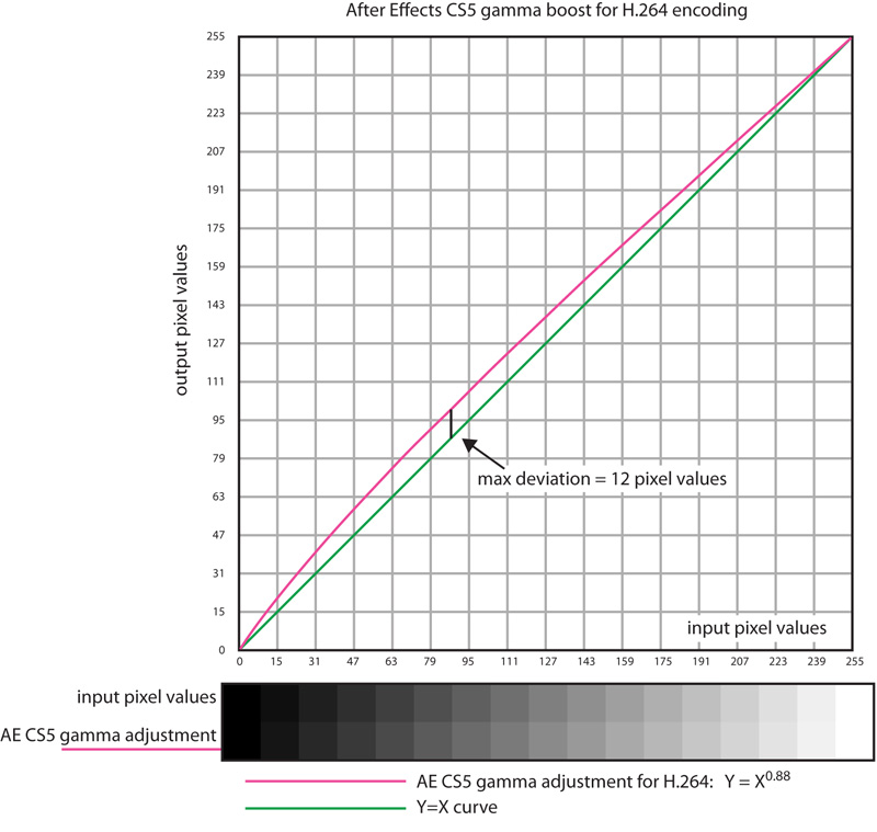 Problem #1: If you use Adobe After Effects CS5 to encode QuickTime H.264 video on a PC, After Effects will first modify the pixel values to boost the mid-tone brightness, by applying a gamma of (1/0.88). Each output_pixel is equal to (input_pixel) ^ 0.88. Here is the input/output transformation curve for RGB gray scale values: The maximum deviation occurs for an input value of 88, which is increased by 12 pixel values: