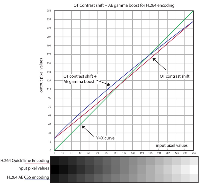 The green line is a reference that shows no change in pixel values (Y = X). The red line shows the transformation applied by the stand alone QuickTime player after decoding pixels from an H.264 bitstream. For example, a decoded value of 0 is transformed to a value of 22. The blue line shows the composite result of having both the After Effects gamma boost before encode, and the contrast shift of the QuickTime player after decode. The H.264 algorithm itself doesn’t significantly change the brightness/contrast/gamma of pixels: In areas of no detail / flat color, the H.264 algorithm changes pixel values by at most 2 pixel values out of 255 for a high quality encoder setting.